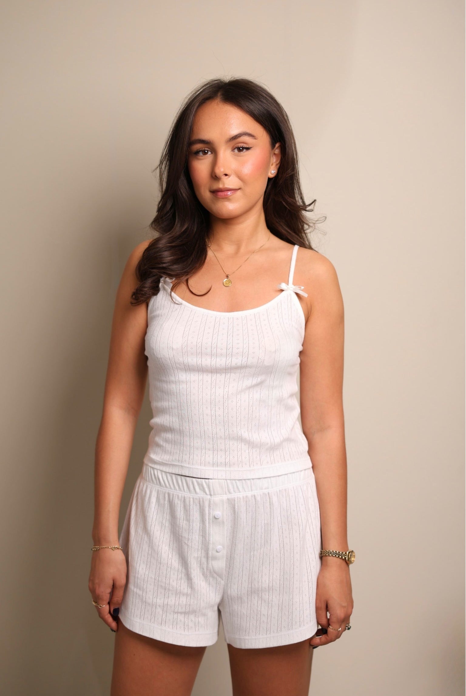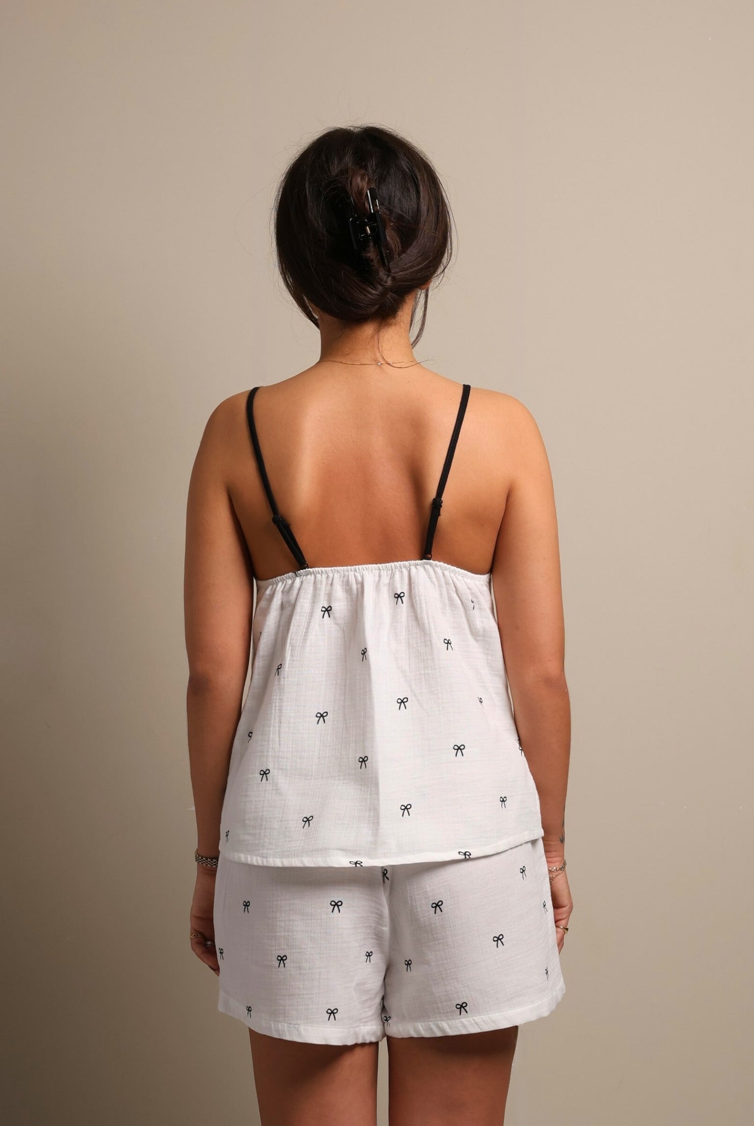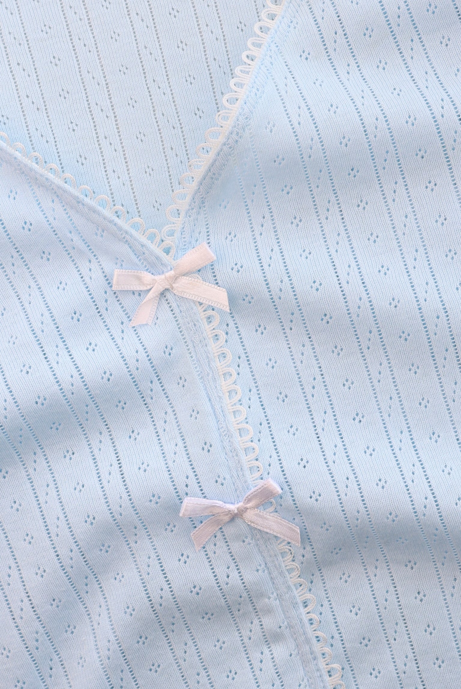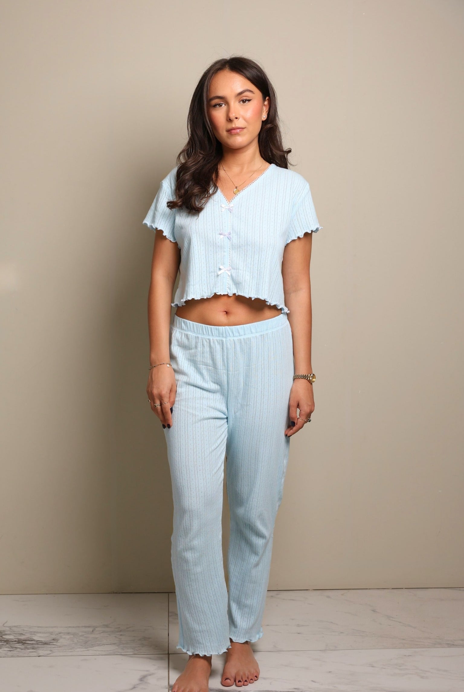 Nga pambuku Pointelle i butë, ky set dy-pjesësh ofron rehati maksimale. Pjesa e sipërme zbukurohet me fjongo, duke i dhënë një prekje delikate stili, ideale për gjumë apo thjesht për t'u çlodhur.